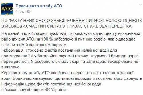 «Информация о фактах поставки некачественной воды для приготовления пищи в батальон отдельной горно-штурмовой бригады сейчас проверяется. У личного состава жалоб и заявлений по поводу заболеваний не выявлено», — говорится в сообщении, обнародованном на странице пресс-центра в Facebook.