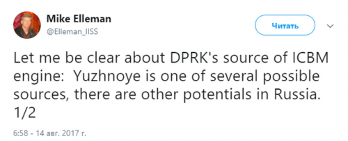 Аналитик Международного института стратегических исследований Эллеман после бурной реакции общественности на свою статью объяснил, что украинское конструкторское бюро «Южмаш», — лишь одно из предприятий, где могли изготовить двигатели для ракет КНДР, в то время как остальные находятся в России.