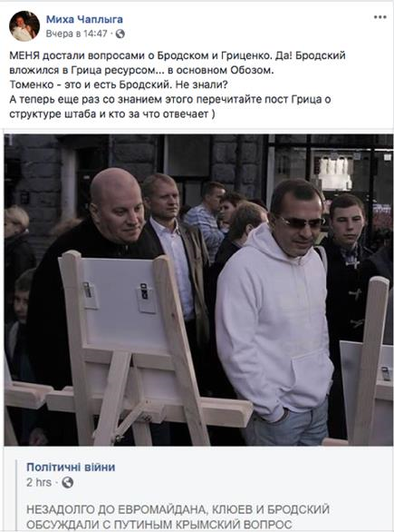О связи Бродского с Гриценко открыто заявлял и политтехнолог Михаил Чаплыга. Он отметил, что собственник издания «Обозреватель» вложил финансовые средства в кампанию Гриценко. «Вести-Украина» тогда писали, что Бродский организовал для своего протеже широкую медийную поддержку.