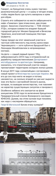 Параллельно с политическими процессами, бизнесмену удалось сдвинуть с «мертвой точки» вопрос о строительстве 4-этажного торгового здания в в центре Киева – на самом Крещатике. Ситуацию описывает в своем Фейсбуке блогер и урбанист Владимир Хенгистов: «Говорят, на Крещатике очень нужен торгово-развлекательный центр — и сразу в четыре этажа, чтобы людям было где купить макароны и крем для обуви. Строить его собираются на месте заброшенного кафе «Гималаи» (два этажа вниз, два этажа вверх). Заказчик строительства — ТОВ «Олимп-ЛТД», которым совместно владеют бывший городской депутат Михаил Бродский и Вячеслав Черепаня, многолетний помощник Нестора Шуфрича. Город продал им этот земельный участок в частную собственность под конец срока мэра Черновецкого — хотя публично Бродский был с Леонидом Михайловичем в непримиримых контрах. На фото — самый первый проект ТРЦ, забракованный в 2014 году и отправленный на доработку предшественниками Департамент строительства и архитектуры. Например, оказалось, что строительный участок заодно прихватывает территорию соседних жилых домов. В конце 2017 года «олимпийцам» согласовали новый проект в Министерстве культуры Украины. Но его до сих пор никто не видел и потому неизвестно, на сколько этажей он уже мог вырасти (как это было с застройкой Сенного рынка, которая, по выводам министерства, «не повлияет на характер существующих силуэтов и панорам»). Особенно забавно это смотрится на фоне инициативы 2018 года по включению Крещатика в Предварительный список Всемирного наследия ЮНЕСКО. Думаю, мы этим сынкам еще покажем, как надо с наследием обращаться».