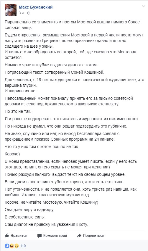 Відомий блогер Макс Бужанський дивується: «Потрясающий текст, сотворённый Соней Кошкиной…..Непосвященный может поначалу принять его за письмо советской девочки из села под Архангельском в школьную стенгазету. Но это не так. Я и раньше подозревал, что писатель и журналист из них именно кот. Но никогда не думал, что они решат подтвердить это публично…..В моём представлении, если человек умеет писать, если у него есть этот дар, талант, он его скрыть не может при желании) Ночью разбуди пьяного — выдаст текст на своём общем уровне. Если днем в посте пишет убого и коряво, это и есть его стиль. Нет утонченности, и не появляется она, хоть триста раз напиши, как любишь Италию, классическую музыку и т. д.», — пише Бужанський, в словах якого користувачі знайшли розумне зерно.