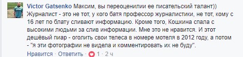 Віктор Гаценко додає, що блогер явно переоцінив талант Кошкіної, згадуючи про початок її кар’єри та чутки про інтимні стосунки з політиками.