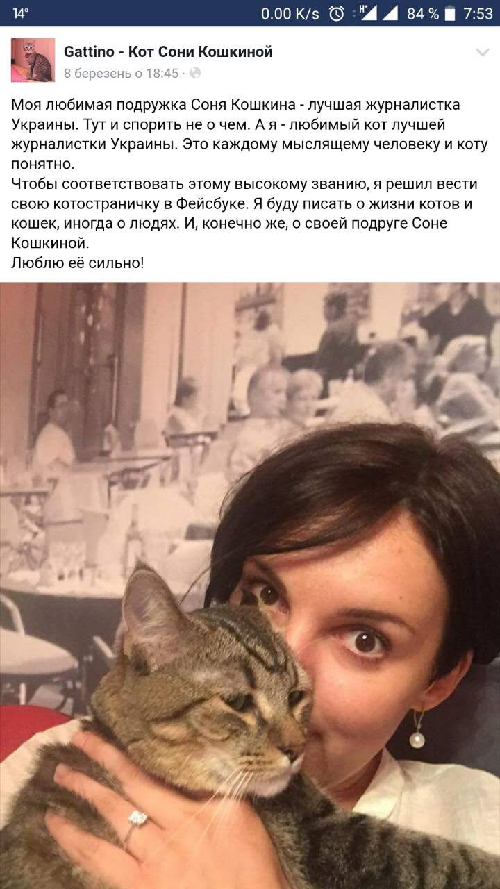 Ось уривок з допису на сторінці «Gattino – Кот Сони Кошкиной»: «Моя любимая подружка Соня Кошкина – лучшая журналистка Украины. Тут и спорить не о чем. А я – любимый кот лучшей журналистки Украины. Это каждому мыслящему человеку и коту понятно. Чтобы соответствовать этому высокому званию, я решил вести свою котостраничку в Фейсбуке…».