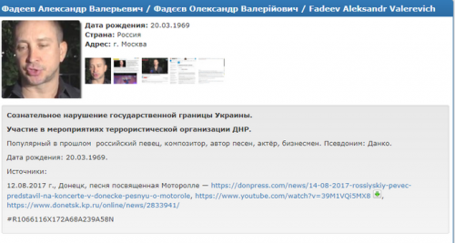 Российский певец Александр Фадеев, известный как Данко, выступил в оккупированном Донецке с песней об убитом боевике ДНР Арсене Мотороле Павлове, после чего пополнил списки преступников «Миротворца».