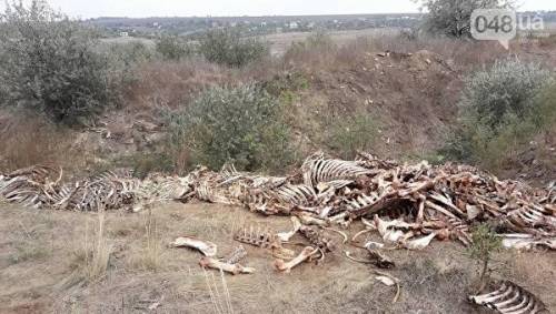 В селе Александровка под Одессой на побережье Аджалыкского лимана лежит огромное количество туш коров и свиней.