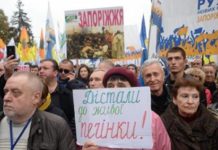 Участники акции заявляют поочередно на румынском и украинских языках, что новым законом об образовании правительство ущемляет нацменьшинства. Они призывают местные власти обратится к президенту...