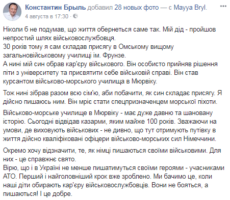 «Мой сын выбрал карьеру военного. Он лично принял решение уйти из университета и посвятить себя военному делу. Он стал курсантом военно-морского училища в Мюрвике», — написал Брыль на своей странице в Facebook.