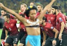 На груди у девушки было написано Erdogan Killer. Активистка организации Femen появилась на поле, когда команды позировали для телекамер перед стартовым свистком.