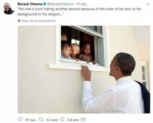 «Никто не рождается с ненавистью к другому человеку из-за цвета кожи, происхождения или религии. Люди должны учиться ненавидеть, и если они могут научиться ненавидеть, то их можно научить любить, потому что любовь более естественна человеческому сердцу, чем ее противоположность — Нельсон Мандела», — написал Обама. Запись была разделена на три твита.