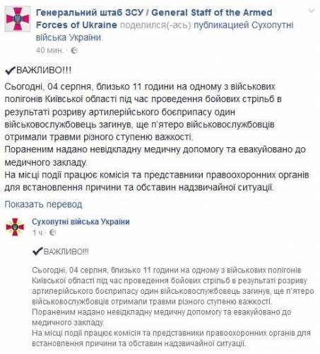 «Сегодня, 4 августа, около 11 часов на одном из военных полигонов Киевской области во время проведения боевых стрельб в результате разрыва артиллерийского боеприпаса один военнослужащий погиб, еще пятеро военнослужащих получили травмы разной степени тяжести», — говорится в сообщении.