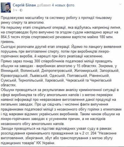 «На первом этапе специальной операции, которая состоялась в конце июля, на спиртзаводах было изъято и впоследствии судом наложен арест на 864,5 тысяч литров спиртосодержащих веществ стоимостью почти 180 млн гривен. Сегодня начали второй этап операции. Идем по цепи обнаружения нарушений при изготовлении спирта, затем при производстве ликеро-водочных изделий, и, наконец, при его реализации населению», — сообщил Билан.