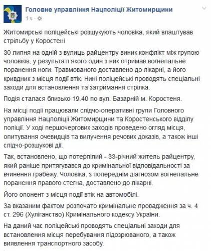 Скриншот поста в Facebook ГУ Нацполиции в Житомирской области