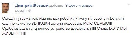 «Сегодня утром я как обычно вёз ребёнка и жену на работу и детский сад, но какие-то ублюдки хотели подорвать мою семью! Сработало дистанционное устройство взрывчатки», — написал Жвавый на своей странице в Facebook.