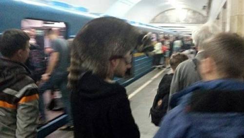 . В метрополитене Киева были замечены необычные пассажиры — молодой человек и енот у него на голове.