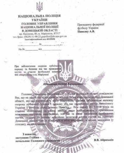Полиция Донецкой области направила письмо в Федерацию футбола Украины (ФФУ) с гарантиями обеспечения безопасности на матчах Премьер-лиги в Мариуполе.