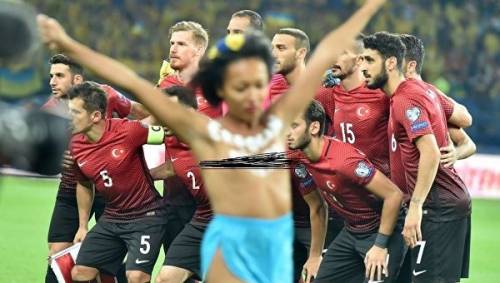 На груди у девушки было написано Erdogan Killer. Активистка организации Femen появилась на поле, когда команды позировали для телекамер перед стартовым свистком.
