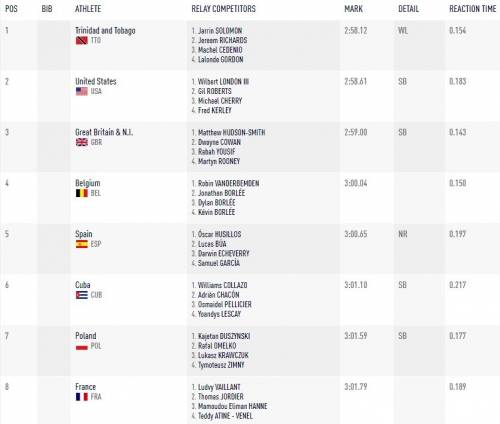 Буквально до последних 200 метров дистанции США шли на первом месте, держа позади Тринидад и Тобаго с Великобританией, однако на последнем этапе Лелонде Гордон сделал невероятное, опередив своего соперника Фреда Керли.