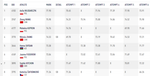 В четвертой попытке Влодарчик метнула молот за 77 метров и окончательно сняла все вопросы о золотой медали. Позже полячка произвела контрольный «выстрел», улучшив свой результат на 51 сантиметр.